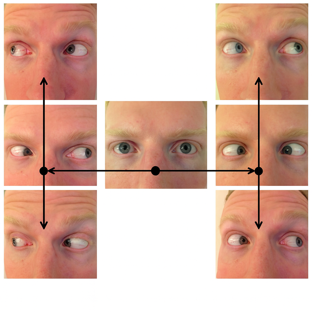 การตรวจนี้เราเรียกกว่า “version test” ซึ่งเราจะเคลื่อนเป้ามองเป็นรูปตัว “H-pattern” เพื่อดูขีดจำกัด (limit) ของกล้ามเนื้อแต่ละมัดว่าไปได้สุดหน้าที่ของตนหรือไม่ (มีใครอู้หรือไม่) โดยทั่วไปเราจะดูว่า การเคลื่อนที่ราบเรียบหรือไม่ (smooth) , เกาะเป้าได้แม่นยำหรือไม่ (Accuracy) , ไปได้สุดขีดจำกัดหรือไม่ (full) และ เมื่อเราแกล้งดึงให้เกินขีดจำกัดคนไข้ทำได้หรือไม่ (extention) ถ้าผลตรวจออกมาดี เราก็บันทึกว่า SAFE (ซึ่งเป็นคำย่อด้านบนนั่นหล่ะ) แต่ถ้าผิดปกติอะไร ก็โน้ตลงไป