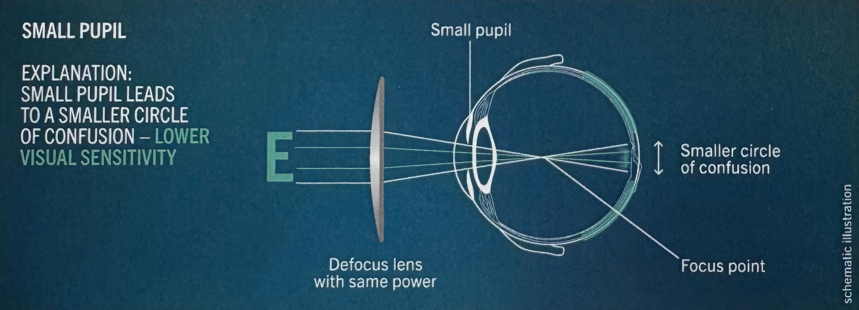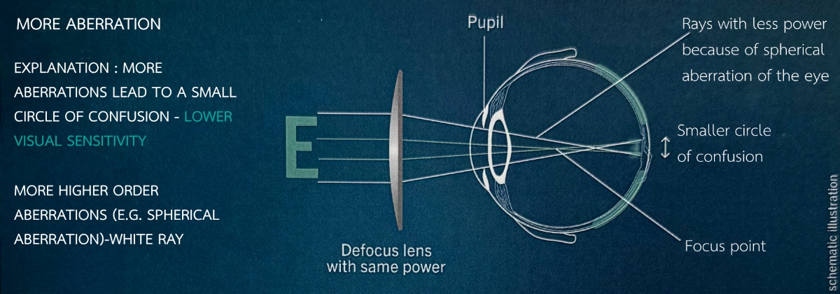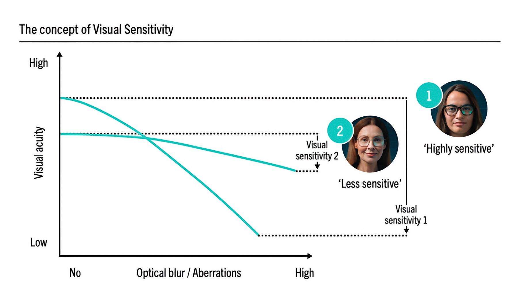 เราทราบดีว่าความไวในการรับรู้ทางการมองเห็น (visual sensitivity) นั้นมีลักษณะเฉพาะในแต่ละบุคคลและมีระดับความไวตั้งแต่สูงไปจนถึงต่ำ ความแตกต่างนี้สามารถอธิบายได้ด้วยกราฟโดยแกนตั้ง (vertical axis) แสดงการเปลี่ยนแปลงของความชัดเจนในการมองเห็น (Visual Acuity – VA) โดยสมมติว่า VA ที่จุดตัดแกนคือค่าสูงสุดที่ได้รับการแก้ไขแล้ว (best corrected VA) ส่วนแกนนอน (horizontal axis) แสดงระดับของความคลาดทางแสง (aberration) หรือความพร่ามัวทางสายตา (optical blur) ที่เกิดขึ้น