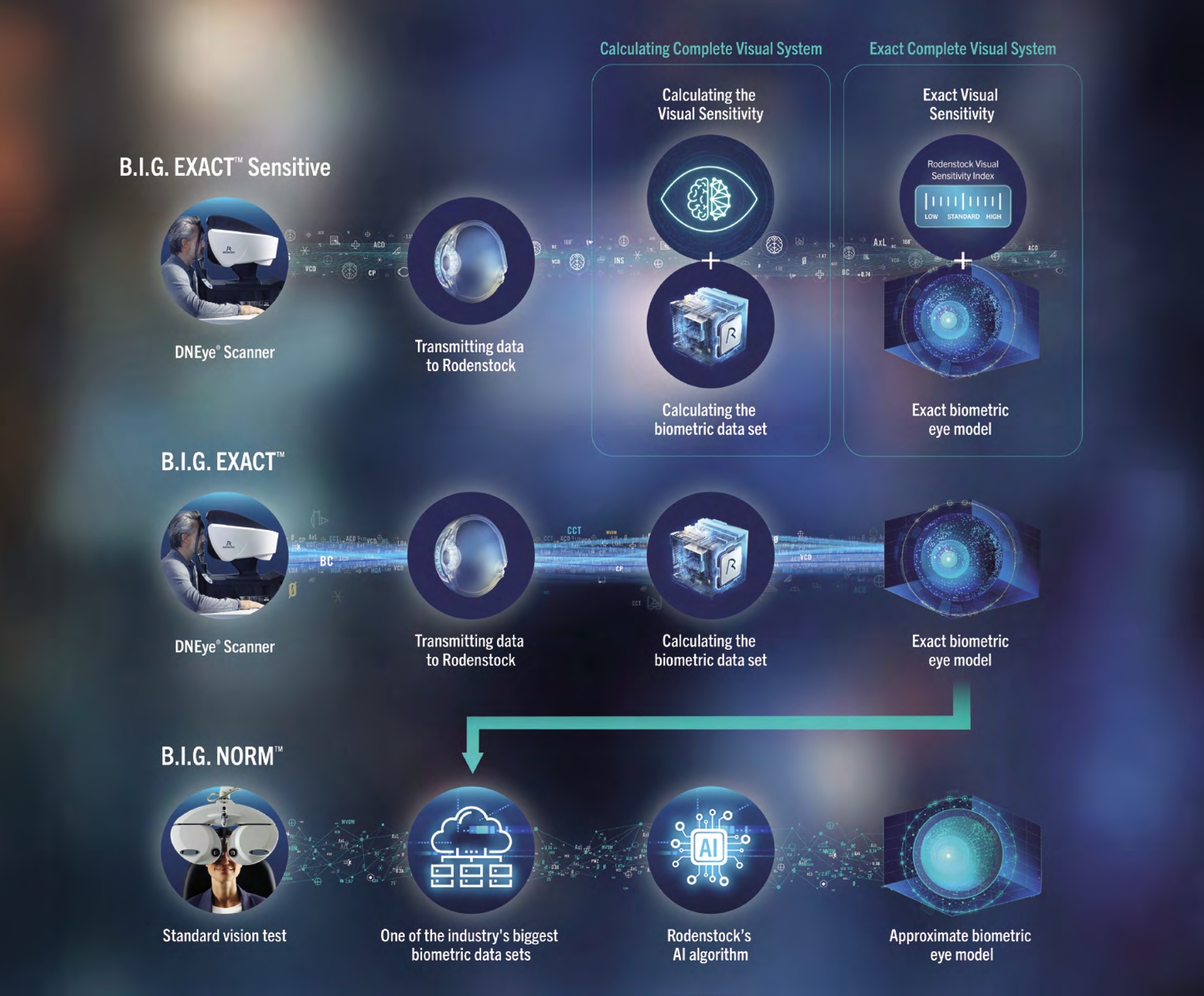 เพื่อตอบโจทย์ต่อความซับซ้อนในระดับนี้ Rodenstock จึงได้พัฒนาแบบจำลองด้วย ปัญญาประดิษฐ์ (Artificial Intelligence – AI) ขึ้นมาเพื่อประเมินและวิเคราะห์ระดับความไวทางการมองเห็นของแต่ละบุคคลอย่างแม่นยำ และค่าความไวทางการมองเห็นเฉพาะบุคคล ที่ได้จาก AI นี้จะถูกนำมาร่วมกับ ข้อมูลชีวภาพเฉพาะบุคคลของดวงตา (individual biometry) เพื่อนำไปคำนวณออกแบบเลนส์แว่นตาเฉพาะรายบุคคลอย่างแท้จริง ซึ่งเลนส์ที่ถูกผลิตขึ้นด้วยวิธีนี้มีชื่อว่า B.I.G. Exact Sensitive