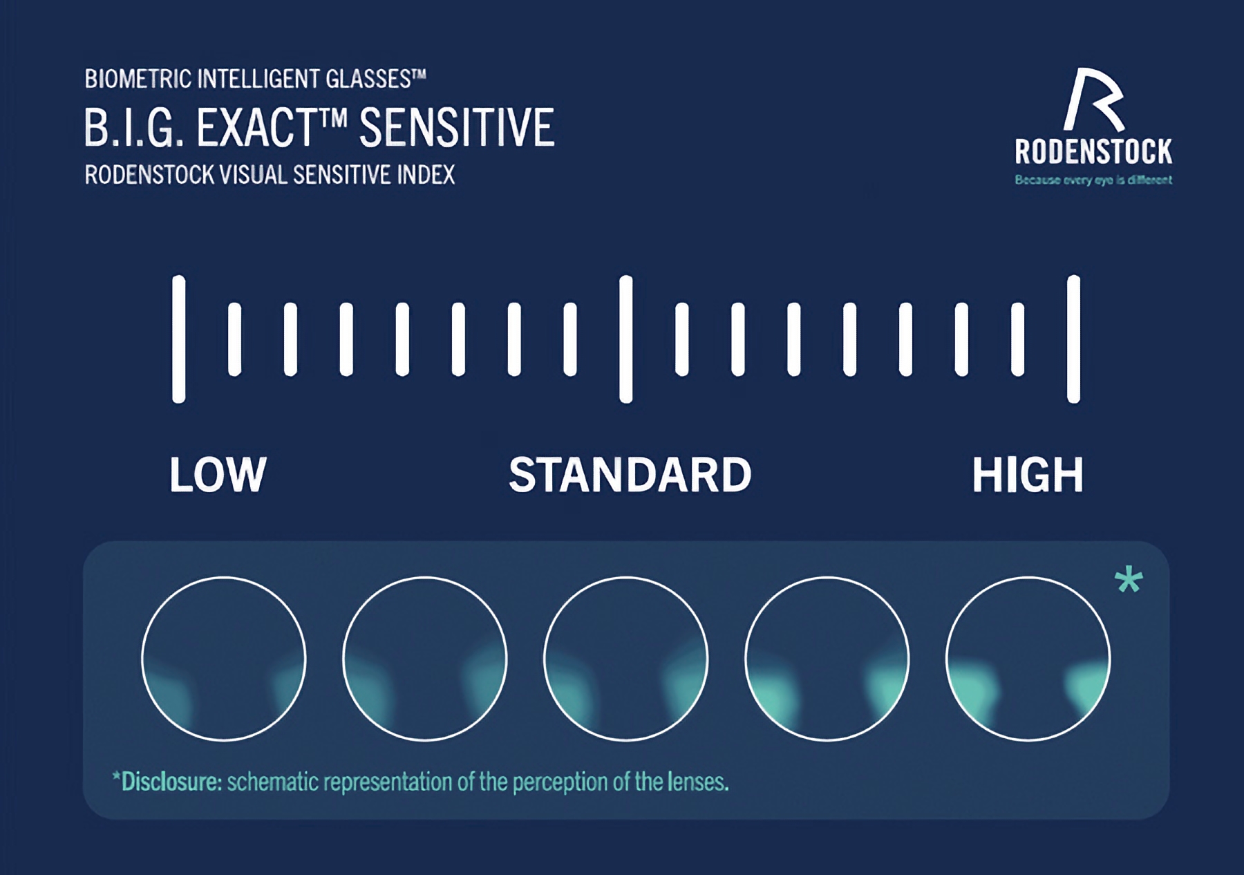 ล่าสุด Rodenstock ได้ยกระดับไปอีกขั้นด้วยการเปิดตัว B.I.G. EXACT™ Sensitive ซึ่งเป็นเลนส์ที่ไม่เพียงแต่คำนึงถึงข้อมูลชีวภาพ (biometric data) ของดวงตาแต่ละบุคคลเท่านั้น หากยังผสานข้อมูลเกี่ยวกับ ความไวต่อความผิดปกติทางสายตา (visual sensitivity) ที่แตกต่างกันในแต่ละบุคคล เพื่อการออกแบบเลนส์ที่แม่นยำและตอบสนองต่อการรับรู้ทางสายตาของผู้สวมใส่ได้อย่างแท้จริง