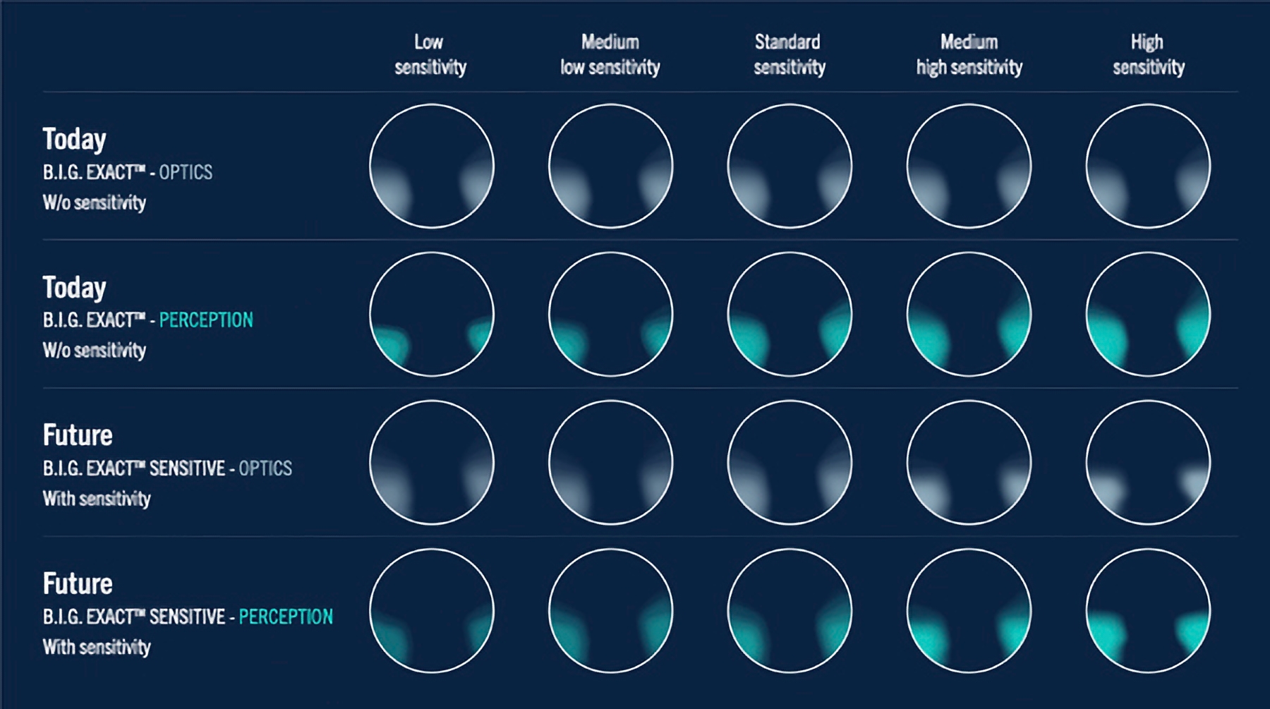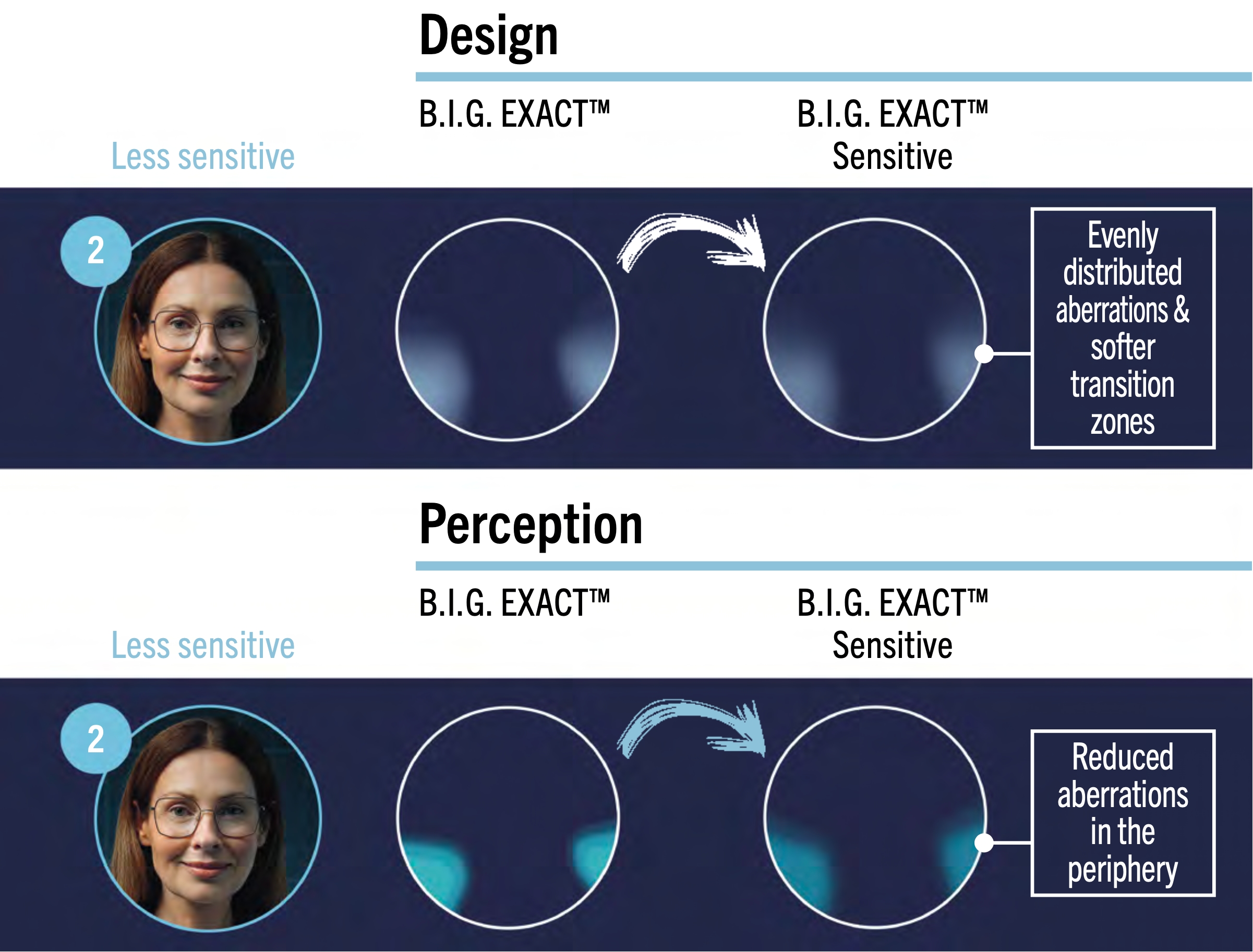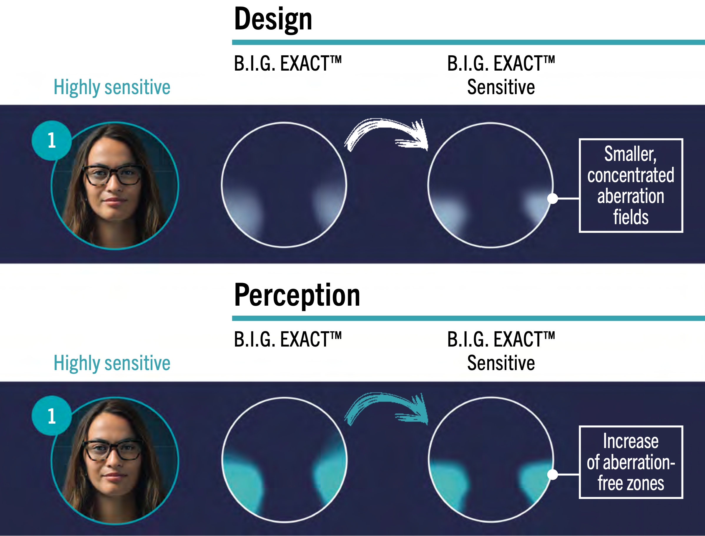 สำหรับเลนส์ B.I.G. Exact™ ที่ใช้การออกแบบเดียวกัน ความคลาดแสงในเชิงทางแสง (aberration pattern)) จะเหมือนกันสำหรับผู้ใช้ทุกคน แต่การรับรู้ถึงความคลาดแสงนั้น (perception) จะแตกต่างกันอย่างมาก ขึ้นอยู่กับระดับความไวทางการมองเห็น ยิ่งผู้ใช้มีความไวทางสายตา (sensitivity) สูงมากเท่าใด ความคลาดเคลื่อนเชิงแสง (aberration perception) ก็จะดูเด่นชัดและกว้างขึ้นในสายตามากเท่านั้น