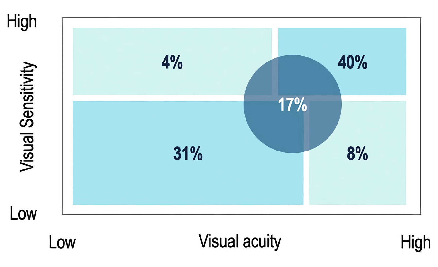 ภาพจากกราฟด้านบนแสดงให้เห็นถึงความแตกต่างของระดับความไวต่อการมองเห็นในผู้ใช้งานที่มีปฏิกิริยาต่อความพร่ามัวของภาพจากความคลาดแสง (aberrations) ที่เกิดขึ้นในเลนส์แว่นสายตา ซึ่งอาจเป็นได้ทั้งในลักษณะที่ไวมากหรือไวน้อย